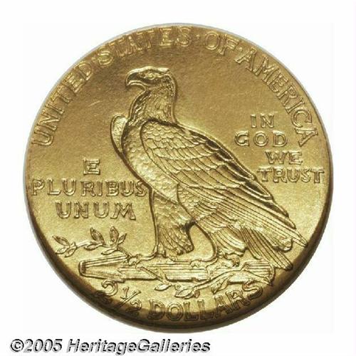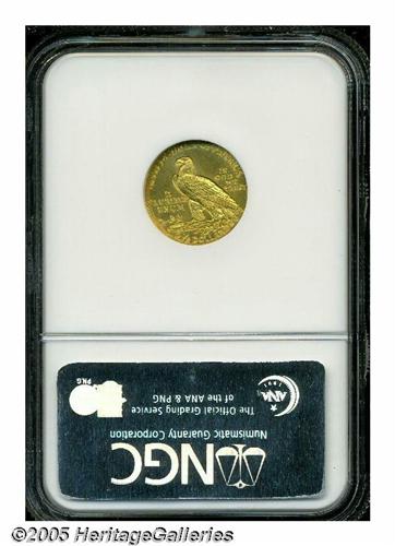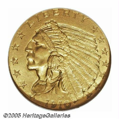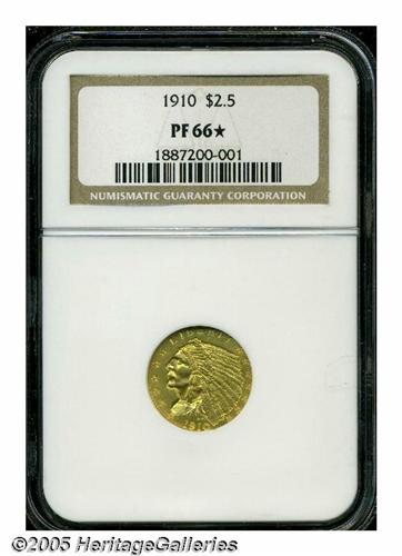 <B>1910<$2 1/2> PR66 <S NGC.</B></I> The proof mintage for the 1910 Quarter Eagle is officially listed as 682 pieces. Many 20th century gold specialists, however, consider this to be incorrect, perhaps the result of a typographical error. It is thought that the original mintage figure was somewhere in the area of 175 to 200. Of these, an estimated 75 to 90 coins exist today. The 1910 issue continues the Roman Gold or Satin Finish proofing process for gold proofs as begun the previous year, this being a brighter variant of the matte proofing process. Offered here is a vibrant Premium Gem with more eye appeal than is usually encountered, even on high grade specimens. The design elements are needle sharp and there are mentionable disturbances on either side. Population: 2 in 66 <S, 1 finer (5/05).