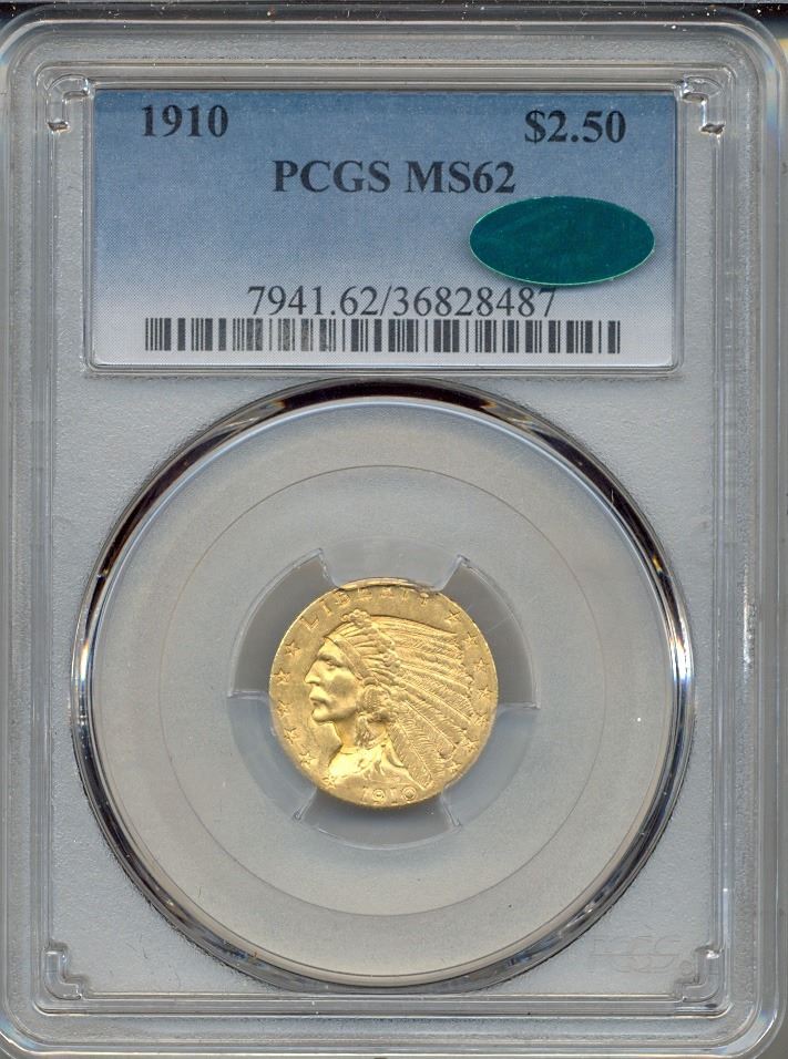 One 1910 $2.5 Indian Head Quarter Eagle Gold Coin PCGS MS62 CAC.