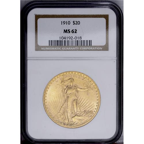 <B>1910<$20> MS62 NGC.</B></I> A few minor contact marks and luster grazes are scattered over the bright, apricot-gold surfaces. Excellent definition is apparent on the design elements, including the olive branch and Liberty's fingers.