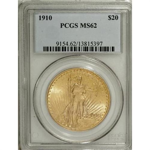 <B>1910 $20 MS62 PCGS.</B></I> PCGS Population (1578/2607). NGC Census: (2298/2701). Mintage: 482,000. Numismedia Wsl. Price for NGC/PCGS coin in MS62: $735. (#9154)<BR><BR><B>Coin Engraver:</B> Augustus Saint-Gaudens<BR><BR><b>Shipping:</b> Coins & Currency (<a target="_blank" href="http://www.heritageauctions.com/common/shipping.php">view shipping information</a>\)