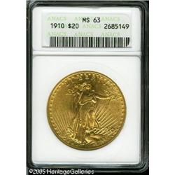 <B>1910 $20 MS63 ANACS.</B></I> Bright, lustrous surfaces display peach-gold patina and well struck design elements. Devoid of significant abrasions. Some alloy spots are noted in the right reverse field. Lot:9503