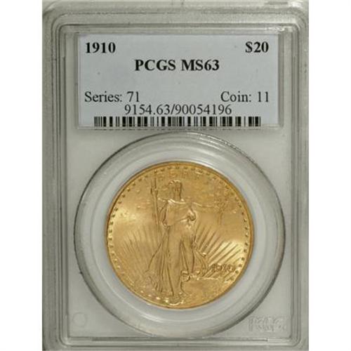 <B>1910 $20 MS63 PCGS.</B></I> PCGS Population (1582/977). NGC Census: (1867/827). Mintage: 482,000. Numismedia Wsl. Price for NGC/PCGS coin in MS63: $885. (#9154)<BR><BR><B>Coin Engraver:</B> Augustus Saint-Gaudens<BR><BR><b>Shipping:</b> Coins & Currency (<a target="_blank" href="http://www.heritageauctions.com/common/shipping.php">view shipping information</a>\)