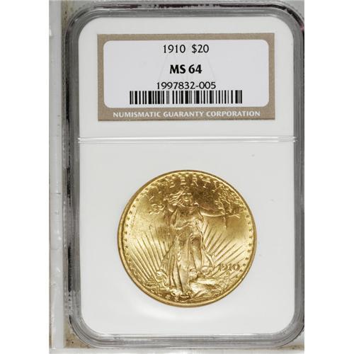 1910 $20 MS64 NGC. A highly lustrous example, solidly