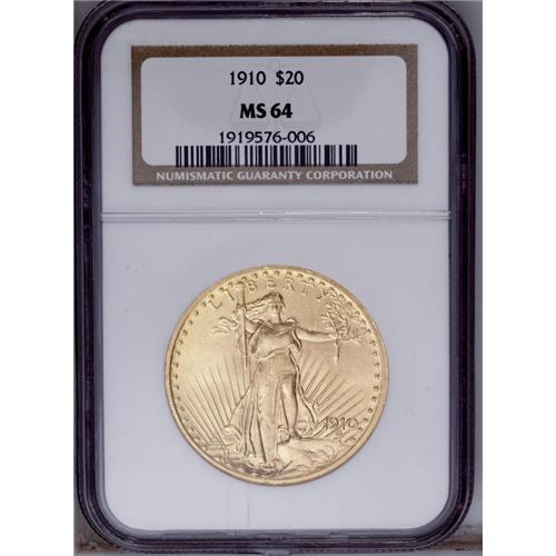 <B>1910<$20> MS64 NGC.</B></I> A lustrous and only lightly marked near-Gem that provides razor-sharp details on the Capitol building. Two tiny nicks are noted on the obverse rim near 6 o'clock.
