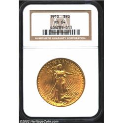 1910 $20 MS64 NGC. An imposing near-Gem that has rich honey-gold color and beautifully preserved fields. Sharply struck, and attractive despite a tiny rim bruise above CA in AMERICA. Important notice: We expect to be auctioning lots at the rate of 200-250 per hour. Sometimes eBay Premier live bid software cannot keep up with that pace, so we strongly recommend that you place a realistic proxy bid now as insurance to avoid disappointment. Also please note that all Heritage/CAA lots purchased through eBay Premier carry a 20% Buyer's Premium. Please make sure you read the Terms and Conditions.