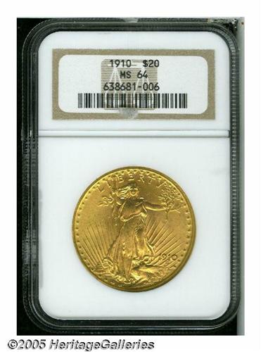 <B>1910<$20> MS64 NGC.</B></I> Well struck, with rich yellow-gold luster and frosty surfaces. The fields have a very slight orange-peel texture and give this piece an overall very attractive appearance.
