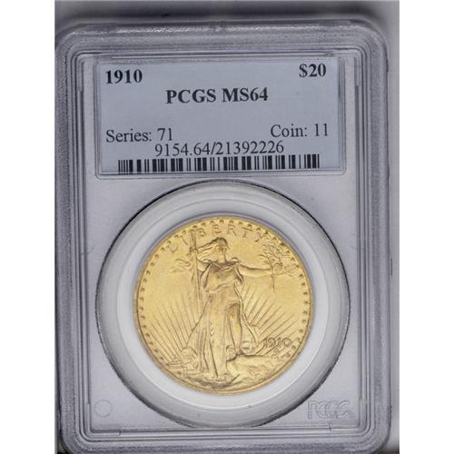 <B>1910<$20> MS64 PCGS.</B></I> A lovely example of this issue, with coruscating luster over straw-gold surfaces, boldly struck, and with few singularly mentionable abrasions. As Gems of this issue are both rare and expensive, this near-Gem example should appeal to many, both for its high quality and its good value. PCGS has graded 88 pieces finer (4/06).