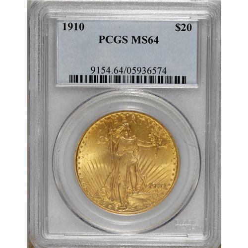 <B>1910 $20 MS64 PCGS.</B></I> A moderately scarce Philadelphia issue that possesses a green-gold cast and vibrant luster. An attentive strike leaves sharp definition on the design features, further enhancing the coin's overall appeal. The fine-grained surfaces reveal just a few minute grade-defining marks.<BR><BR><b>Shipping:</b> Coins & Currency (<a target="_blank" href="http://www.heritageauctions.com/common/shipping.php">view shipping information</a>)