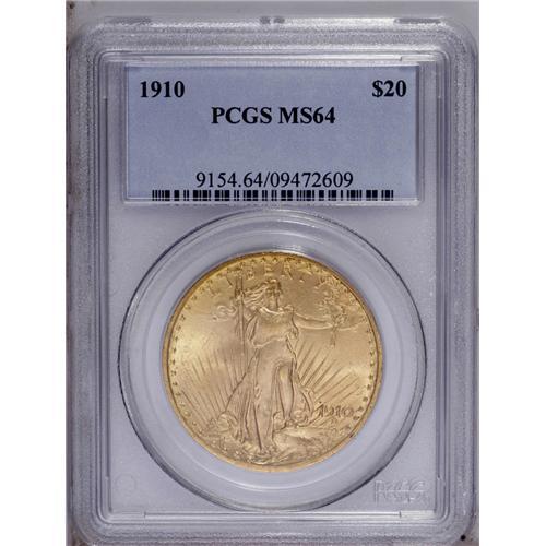 <B>1910<$20> MS64 PCGS.</B></I> Although hardly considered a rare date, or even a scarce date, this issue is elusive in higher grades. In fact, PCGS has only certified 79 finer examples (1/06). Sharply struck with rich honey-gold luster.