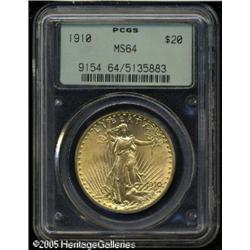 <B>1910 $20 MS64 PCGS.</B></I> Elusive any finer and relatively scarce in its own right, this is a richly colored near-Gem. The green-gold surfaces display sharply struck, problem-free features and scintillating frosty luster.<BR><I>Ex: 1999 FUN Signature Sale (Heritage 1/99), lot 8471.</B></I><BR><I>From The Richard J. Chouinard Collection of United States Coins, Part Two.</B></I> Lot:9506