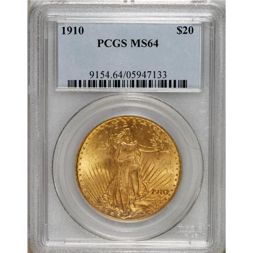 <B>1910 $20 MS64 PCGS.</B></I> Luster dominates the peach-tinted surfaces of this attractive Saint-Gaudens twenty. Evenly struck, and impressive for its designated grade.<BR><BR><b>Shipping:</b> Coins & Currency (<a target="_blank" href="http://www.heritageauctions.com/common/shipping.php">view shipping information</a>)