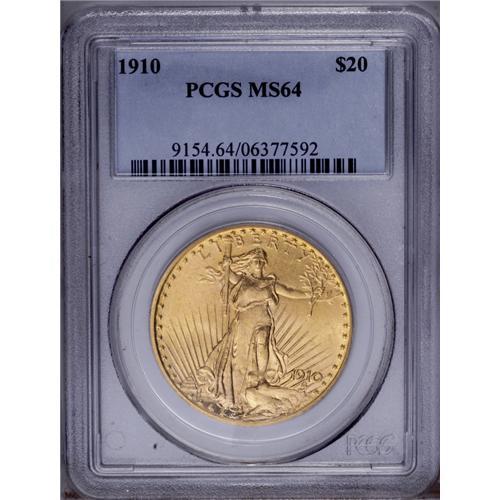 <B>1910<$20> MS64 PCGS.</B></I> Sharply struck with shimmering luster and reddish-golden color. Small marks limit the grade but not the eye appeal of the piece.