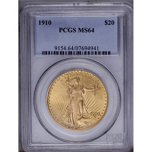 <B>1910<$20> MS64 PCGS.</B></I> A beautiful mustard-gold near-Gem that benefits from an attentive strike and smooth surfaces. Slight flatness on Liberty's knee is usual for early issues of the type.