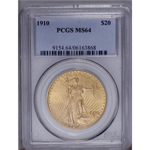 <B>1910 $20  MS64 PCGS.</B></I> The color is a delicious honey-gold, with fine-grained, satiny surfaces. Well struck and featuring a bare minimum of mentionable marks, one tick near the torch handle and a couple of bagmarks well hidden in the eagle's wings. Extremely appealing, and high-end for the assigned grade. PCGS has graded 79 pieces finer (12/05).