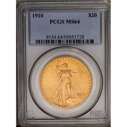 <B>1910<$20> MS64 PCGS.</B></I> The matte-like surfaces display lovely, softly frosted luster and pleasing light green-gold and peach coloration. The striking details are bold, and the surface marks seem normal, for the MS64 grade level.