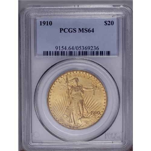 <B>1910 $20  MS64 PCGS.</B></I> The satiny surfaces are highly lustrous, with pleasing, variegated shades of mint-green and peach-gold displayed on both sides. A few small and medium-sized contact marks, mostly on the reverse, limit the grade. Scarce any finer.