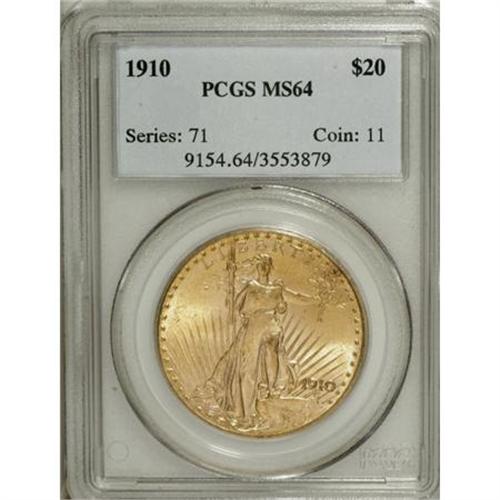 <B>1910 $20 MS64 PCGS.</B></I> Rich honey-gold toning and intense luster are the hallmarks of this alluring near-Gem. A few minuscule blemishes are found in the obverse fields, and a faint pinscratch extends from just behind the eagle's mouth across the shoulder area. <BR><I>From The Vanek Collection.</B></I><BR><BR><b>Shipping:</b> Coins & Currency (<a target="_blank" href="http://www.heritageauctions.com/common/shipping.php">view shipping information</a>)