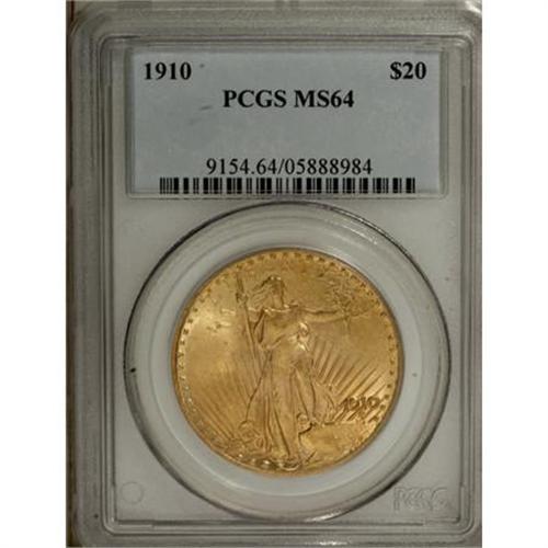 <B>1910 $20 MS64 PCGS.</B></I> Solidly struck with strong luster for this Philadelphia issue. Subtle olive accents visit the margins of this otherwise butter-yellow piece, which shows just a few too many marks for Gem status.<BR><BR><B>Coin Engraver:</B> Augustus Saint-Gaudens<BR><BR><b>Shipping:</b> Coins & Currency (<a target="_blank" href="http://www.heritageauctions.com/common/shipping.php">view shipping information</a>)