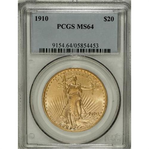 <B>1910 $20 MS64 PCGS.</B></I> Pale straw-gold surfaces offer vibrant luster, and the slightly deeper yellow-gold devices show pleasing detail. Attractive with only a few light, scattered marks that account for the grade.<BR><BR><B>Coin Engraver:</B> Augustus Saint-Gaudens<BR><BR><b>Shipping:</b> Coins & Currency (<a target="_blank" href="http://www.heritageauctions.com/common/shipping.php">view shipping information</a>)