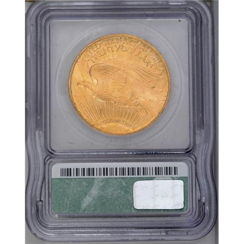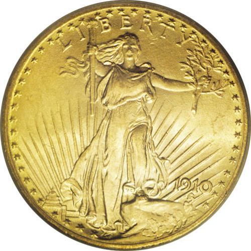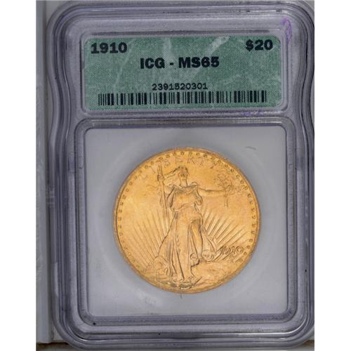 <B>1910<$20> MS65 ICG.</B></I> Vibrant luster and bright khaki-gold toning affirm the eye appeal of this sharply struck Gem. Well preserved apart from a solitary mark on the base of the eagle's front wing. The 1910 is a familiar presence on the bourse floor, although the vast majority of Mint State examples are in MS64 or lower grades.