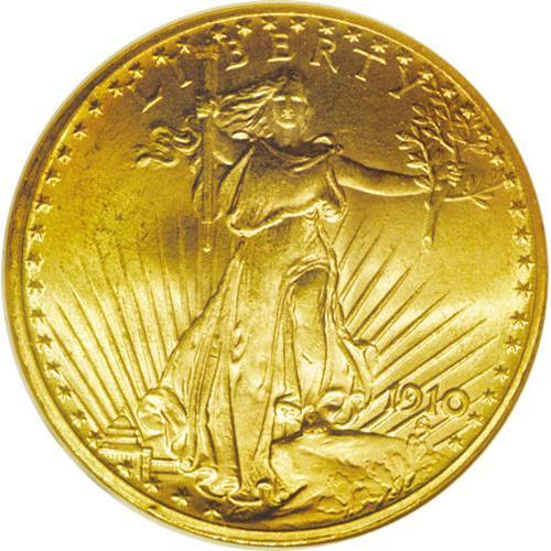 <B>1910<$20> MS65 NGC.</B></I> The 1910 is one of the lesser seen P-mint double eagles in Uncirculated grades. It is especially elusive in Gem condition. Indeed, according to Akers: "Although not nearly as difficult to locate as the other early Philadelphia Mint issues in Gem condition, the 1910 is still definitely rare in MS65, and it takes both a little luck and a little patience to be able to find one." The coin we offer here is a lustrous, sharply defined example that has apricot-gold patina over each side. There are only a handful of small marks on the two sides, the most noticeable one occurring on the chin of Liberty's right (facing) leg. The design elements are well struck up, including nice definition on the Capitol building. Census: 60 in 65, 5 finer (4/06).