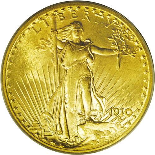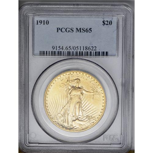 <B>1910<$20> MS65 PCGS.</B></I> This gorgeous Gem double eagle is awash in radiant luster and apricot-gold patina. The surfaces have a somewhat frosty appearance and are finely granular in texture, these being characteristic of the issue. Razor-sharp definition is apparent on the fingers of both of Liberty's hands, on the face, and on the toes, as well as on the eagle's feathers. Both sides are well preserved, with just a small mark on the Capitol building that is mentioned for accuracy.<BR><I>From The Jackson Hole Collection.</B></I>