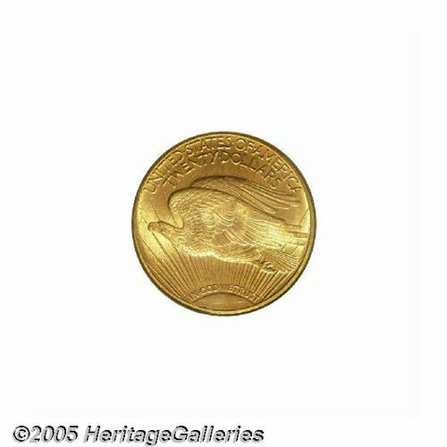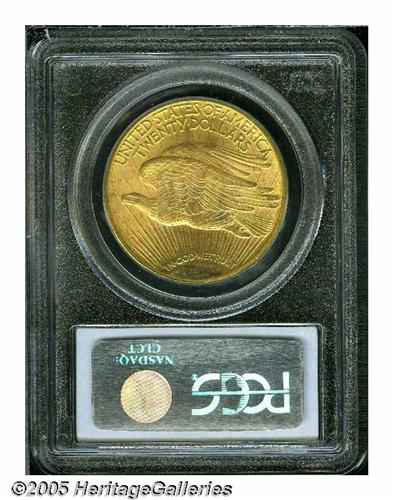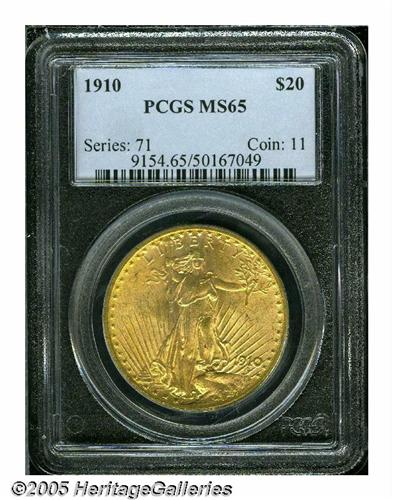 <B>1910<$20> MS65 PCGS.</B></I> In average Uncirculated grades, the 1910-P Saint-Gaudens is relatively common. That situation changes rapidly when looking for something nicer, because average is almost always the way they come. Even MS64 pieces are relatively scarce and true Gems, like the present coin, are very elusive. The satin-like surfaces are richly toned and nearly blemish-free, and are only a couple of very minor contact marks away from being pristine. Head and shoulders above the typical '10-P, an issue that is not often found this well preserved, and is rarely seen in a condition finer than the present example. Population: 53 in 65, 3 finer (6/05).