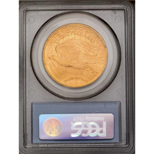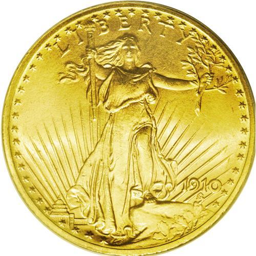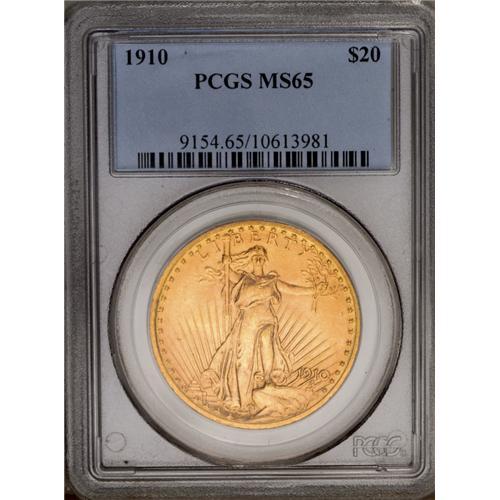 <B>1910<$20> MS65 PCGS.</B></I> The 1910 is plentiful through MS63, and even near-Gems are obtainable with a little patience and searching. There is a noticeable drop in the certified population from near to full Gem, where fewer than 150 examples have been graded by PCGS and NGC combined, and only seven finer. This MS65 specimen displays lustrous peach-gold surfaces that reveal powerful impressions on the design elements. We mention some minute, largely unobtrusive marks on Liberty's breasts and legs. An attractive Gem overall. Population: 86 in 65, 3 finer (5/06).