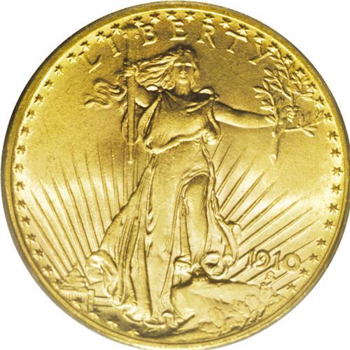 <B>1910 $20 MS65 PCGS.</B></I> This is a beautiful Gem example of the Saint-Gaudens type. Well struck and highly lustrous with matte-like surface textures and a few tiny nicks on each side that are too small to affect the splendid eye appeal of the piece. In lower grades, the 1910 is the most common P-mint Motto double eagle produced from 1908 through 1915, but true Gems such as the present specimen are of the utmost rarity and desirability. Population: 92 in 65, 3 finer (10/06).<BR><BR><b>Shipping:</b> Coin/Currency (<a target="_blank" href="http://www.heritageauctions.com/common/shipping.php">view shipping information</a>)