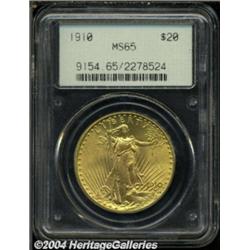 <table><tbody><tr><td><table> <TR><TD width="100%"><TABLE cellSpacing=1 cellPadding=3 width="100%" border=0><TBODY><TR><TD width="100%" bgColor=#79735c><FONT face=arial color=#ffffff size=3><B>Description</B> </FONT></TD></TR><TR><TD width="100%" bgColor=#ffffff><FONT face=arial size=2><B>1910 $20 MS65 PCGS.</B></I> The 1910 is a scarcer P-mint twenty even in the lower grades of Mint State. In Gem grade it is especially elusive with only 30 pieces certified to date (10/03) with only three finer. This is an especially attractive coin that has bright, sparkling mint luster and crisp, complete definition on each side. There are no obvious abrasions on either side of this lovely coin.<BR><I>From a Magnificent Collection of Double Eagles.</B></I> </FONT></TD></TR></TBODY></TABLE></TD></TR></TBODY></TABLE><BR><A name=PricesRealized></A><TABLE cellSpacing=0 cellPadding=0 width="100%" bgColor=#000000 border=0><TBODY><TR><TD width="100%"><TABLE cellSpacing=1 cellPadding=3 width="100%" border=0><TBODY><TR><TD width="100%" bgColor=#79735c><A name=PR><FONT face=arial color=#ffffff size=3><B>Previous Prices from Heritage Auctions</B> </FONT></A></TD></TR><TR><TD bgColor=#f6f6ed><TABLE cellSpacing=0 cellPadding=0 width="100%" border=1><TBODY><TR><TD align=middle width="33%"><B>Date</B></TD><TD align=middle width="33%"><B>Service</B></TD><TD align=middle width="33%"><B>Price</B></TD></TR><TR bgColor=whitesmoke><TD width="33%"><B>06/17/2003</B></TD><TD width="33%">NGC</TD><TD width="33%">$6,325.00</TD></TR><TR bgColor=whitesmoke><TD width="33%"><B>09/03/2002</B></TD><TD width="33%">NGC</TD><TD width="33%">$5,175.00</TD></TR><TR bgColor=whitesmoke><TD width="33%"><B>09/20/2003</B></TD><TD width="33%">NGC</TD><TD width="33%">$5,865.00</TD></TR><TR bgColor=whitesmoke><TD width="33%"><B>09/28/2002</B></TD><TD width="33%">NGC</TD><TD width="33%">$4,945.00</TD></TR><TR bgColor=whitesmoke><TD width="33%"><B>07/30/1994</B></TD><TD width="33%">PCGS</TD><TD width="33%">$4,620.00</TD></TR><TR bgColor=whitesmoke><TD width="33%"><B>01/01/1990</B></TD><TD width="33%">PCGS</TD><TD width="33%">$11,550.00</TD></TR></TBODY></TABLE></TD></TR><TR><TD bgColor=#ffffff><FONT face=arial size=1 ?>PLEASE NOTE: All prices realized reflect the final hammer price PLUS the buyer's premium in auctions that charge a buyer's premium. Each item has a notation at the top of the listing indicating whether that lot included a buyer's premium. Example: A item that sells with a final hammer price of $100 and a 20% buyer's premium will display with a price realized of $120. All information listed is intended to be as accurate as possible, but errors are possible. Please use this guide carefully and inform us of any inaccuracies. </FONT></TD></TR></TBODY></TABLE></TD></TR></TBODY></TABLE><BR><TABLE cellSpacing=0 cellPadding=0 width="100%" bgColor=#000000 border=0><TBODY><TR><TD width="100%"><TABLE cellSpacing=1 cellPadding=3 width="100%" border=0><TBODY><TR><TD width="100%" bgColor=#79735c colSpan=6><FONT face=arial color=#ffffff size=3><B>Price Guide*</B> </FONT></TD></TR><TR bgColor=#f6f6ed><TD align=middle><B>Grade</B> </TD><TD align=middle><B>Coin World<BR>(Trends)</B> </TD><TD align=middle><B>Numismedia<BR>Retail</B> </TD><TD align=middle><B>Numismedia<BR>Wholesale</B> </TD><TD align=middle><B>Coin<BR>Universe</B> </TD><TD align=middle><B>Heritage<BR>Value Index</B> </TD></TR><TR bgColor=#ffffff><TD align=middle>64</TD><TD align=right>$1,500.00</TD><TD align=right>---</TD><TD align=right>$1,075.00</TD><TD align=right>$1,350.00</TD><TD align=right>$1,115.00</TD></TR><TR style="FONT-WEIGHT: bold" bgColor=#cccfdd><TD align=middle>65</TD><TD align=right>$9,000.00</TD><TD align=right>---</TD><TD align=right>$5,225.00</TD><TD align=right>$8,000.00</TD><TD align=right>$5,753.75</TD></TR><TR bgColor=#ffffff><TD align=middle>66</TD><TD align=right>$18,000.00</TD><TD align=right>---</TD><TD align=right>---</TD><TD align=right>---</TD><TD align=right>$20,000.00</TD></TR><TR bgColor=#ffffff><TD colSpan=6><FONT size=1>*All information listed is intended to be as accurate as possible, but errors are possible. No item may be returned or refused based on this information which is provided as a service to our customers. You should contact each pricing source directly to determine the accuracy of this information. </FONT></TD></TR></TBODY></TABLE></TD></TR></TBODY></TABLE><BR><TABLE cellSpacing=0 cellPadding=0 width="100%" bgColor=#000000 border=0><TBODY><TR><TD width="100%"><TABLE cellSpacing=1 cellPadding=3 width="100%" border=0><TBODY><TR><TD width="100%" bgColor=#79735c><FONT face=arial color=#ffffff size=3><B>Population Guide</B> </FONT></TD></TR><TR bgColor=#ffffff><TD align=middle><!-- Begin Output of Population Grid--><TABLE cellSpacing=0 cellPadding=0 width="100%" border=0><TBODY><TR><TD vAlign=center><TABLE cellSpacing=0 width="100%" border=1 cellsadding="3"><TBODY><TR><TD vAlign=center><TABLE cellSpacing=0 cellPadding=3 width="100%" border=1><TBODY><TR><TD vAlign=center align=middle bgColor=#f0f1e8 colSpan=2 <CENTER><FONT face=Arial size=2><B>PCGS Pop </B></FONT><CENTER></CENTER></TD><TD vAlign=center align=middle bgColor=#f0f1e8 colSpan=2><CENTER><FONT face=Arial size=2><B>NGC Pop</B></CENTER></FONT></TD></TR><TR><TD vAlign=center><FONT face=Arial size=2>(65)</FONT> </TD><TD vAlign=center align=right><FONT face=Arial size=2>30</FONT> </TD><TD vAlign=center><FONT face=Arial size=2>(65)</FONT> </TD><TD vAlign=center align=right><FONT face=Arial size=2>37</FONT> </TD></TR><TR><TD vAlign=center><FONT face=Arial size=2>(>65)</FONT> </TD><TD vAlign=center align=right><FONT face=Arial size=2>3</FONT> </TD><TD vAlign=center><FONT face=Arial size=2>(>65)</FONT> </TD><TD vAlign=center align=right><FONT face=Arial size=2>4</FONT> </TD></TR></TBODY></TABLE></TD></TR></TBODY></TABLE></TD></TR></TBODY></TABLE><!-- End Output of Population Grid--></TD></TR></TBODY></TABLE></TD></TR></TBODY></TABLE><BR><TABLE cellSpacing=0 cellPadding=0 width="100%" bgColor=#0