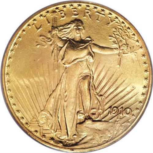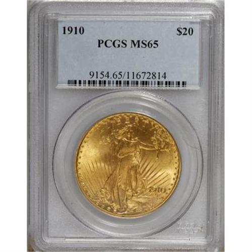 <B>1910 $20 MS65 PCGS.</B></I> Sharp design definition and frosty yellow-gold luster are the hallmarks of this lovely Gem. A few scattered surface marks are evident, defining the grade. This is an elusive issue in the higher grades, with just three finer examples certified by PCGS (6/07).<BR><BR><b>Shipping:</b> Coins & Currency (<a target="_blank" href="http://www.heritageauctions.com/common/shipping.php">view shipping information</a>)