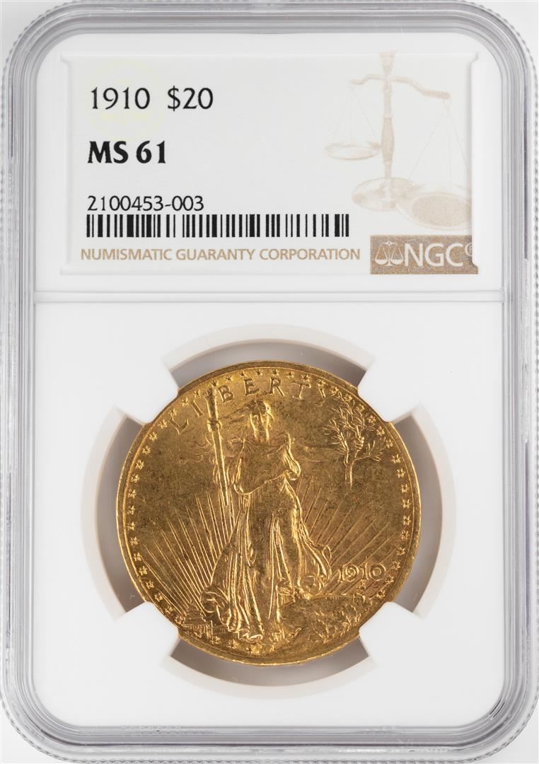 One 1910 $20 St. Gaudens Double Eagle Gold Coin NGC MS61. NGC Certified.