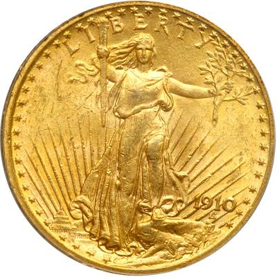 1910 $20 St. Gaudens. PCGS graded MS-63. Lovely golden toning. This relatively affordable contribution to the sale is brilliant with rich frosty gold surfaces. Impressive too is the strike, which we find is free of censure, being sharp in all areas including Liberty's facial features and the front edge of her sandal (PCGS # 9154) .