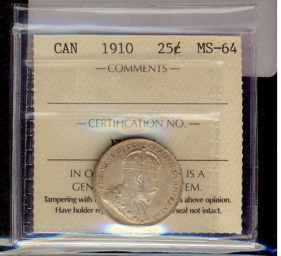 1910 25¢ ICCS MS-64. Light toning over full underlying luster. Excellent strike with clean fields and lovely surfaces.
