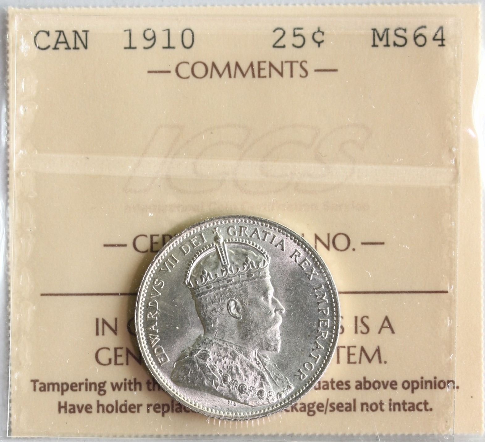 1910 25¢ ICCS Very Choice Mint State-64 Fully brilliant and lustrous. A very nice Edwardian type coin.