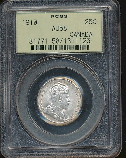1910 25¢ PCGS AU58. Definitely of PQ quality for grade.