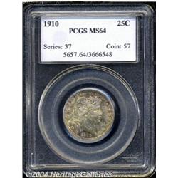 <B>1910<25C> MS64 PCGS.</B></I> The surfaces are decorated by extensive speckled multicolored patina on both sides, and illuminated by vibrant underlying luster. The striking details are quite bold, and there are only two or three trivial contact marks, on the obverse. Perhaps conservatively graded, as a near-Gem. Population: 44 in 64, 33 finer (3/04).<BR><I>From the JFS Collection.</B></I> <BR><BR><B>Important notice:</B> Heritage usually auctions material at the rate of 200-250 lots per hour. On some occasions eBay Live bid software or the Internet may not be able to keep up with the pace of the auction. We recommend placing a realistic absentee bid now as insurance to avoid disappointment. Occasionally the auctioneer may eliminate or reject an eBay Live bid, and the auctioneer may also reopen a lot after the close of the eBay live bidding (usually because we missed an audience bid), and may reject your bid even if it shows you as the winning bidder. By bidding via eBay Live, you agree that Heritage may award the lot to another bidder at its sole discretion under the circumstances described above or any other reasonable circumstances. Since eBay bids are not shown to us until we open the lot on the floor, we treat those bids just like floor bids. In most cases the floor responds before the eBay bid is presented to us, due to Internet lag time, so for consistency we have made it a policy that floor bids are always considered first over tie eBay live bids. Also please note that all Heritage lots purchased through eBay Live carry a 20% Buyer's Premium. Please make sure you read the Terms and Conditions before you bid. </span></font></tr></table></td></tr></table>
