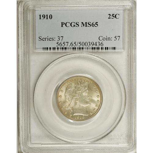 <B>1910 25C MS65 PCGS.</B></I> Olive-gold toning uniformly covers soft, satiny surfaces. Original and essentially pristine. A truly lovely and conditionally scarce Gem Barber quarter. Population: 28 in 65, 18 finer (4/07).<BR><BR><b>Shipping:</b> Coins & Currency (<a target="_blank" href="http://www.heritageauctions.com/common/shipping.php">view shipping information</a>)
