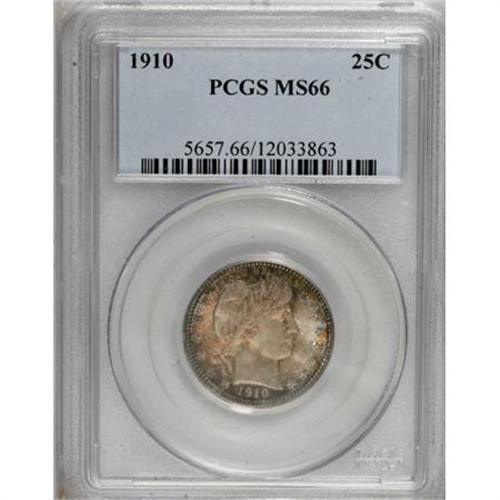 <B>1910 25C MS66 PCGS.</B></I> A lovely Premium Gem example of this later Barber issue, pleasingly detailed with areas of rich amber and peach patina over the otherwise silver-gray surfaces. Carefully preserved and desirable. Population: 16 in 66, 3 finer (10/07).<BR><BR><B>Coin Engraver:</B> Charles E. Barber<BR><BR><b>Shipping:</b> Coins & Currency (<a target="_blank" href="http://www.heritageauctions.com/common/shipping.php">view shipping information</a>)