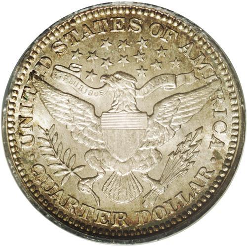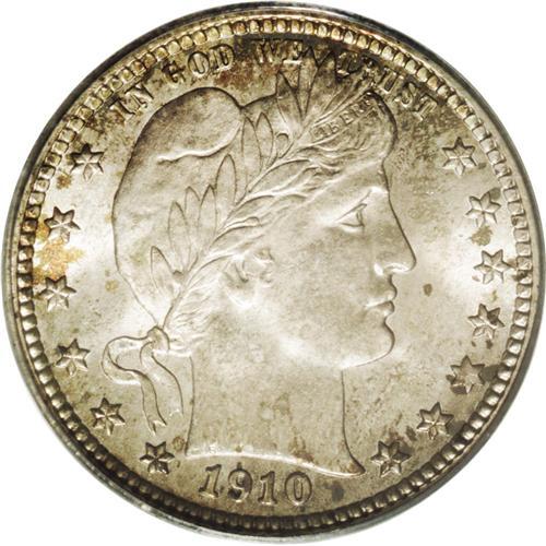 <B>1910<25C> MS67 PCGS.</B></I> A lovely, totally original coin offering tinges of carmine, gold, lime-green, and electric-blue in an irregular pattern over brilliant, lustrous surfaces. The strike is meticulously executed, although slight weakness remains on the right shield corner and the eagle's right claw. A few minuscule, grade-consistent abrasions appear under a loupe. One of three coins so graded at PCGS, with none finer (6/06).
