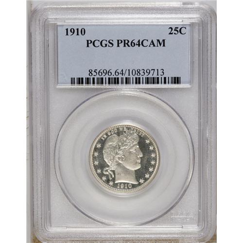 <B>1910 25C PR64 Cameo PCGS.</B></I> This Choice Proof is black-and-white save for a small spot of charcoal-gray below Liberty's ribbon. The obverse fields have a few isolated hairlines. Population: 14 in 64 Cameo, 23 finer (11/06).<BR><BR><b>Shipping:</b> Coin/Currency (<a target="_blank" href="http://www.heritageauctions.com/common/shipping.php">view shipping information</a>)