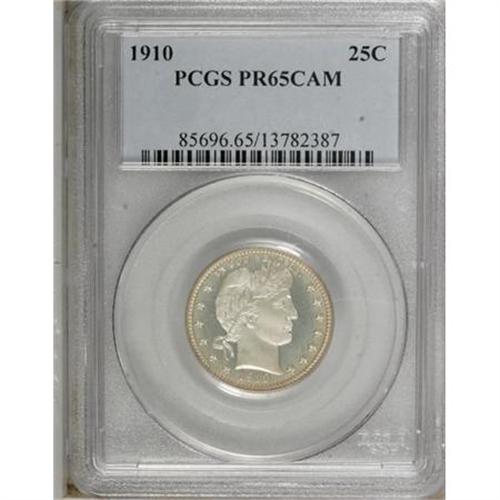 <B>1910 25C PR65 Cameo PCGS.</B></I> Lightly frosted ivory devices emerge from gleaming fields on this 20th century Barber proof. Though rich gold-gray toning appears at the margins, the thin veil of patina that drapes the fields has little effect on the coin's contrast. Population: 11 in 65 Cameo, 13 finer (11/07).<BR><BR><b>Shipping:</b> Coins & Currency (<a target="_blank" href="http://www.heritageauctions.com/common/shipping.php">view shipping information</a>)