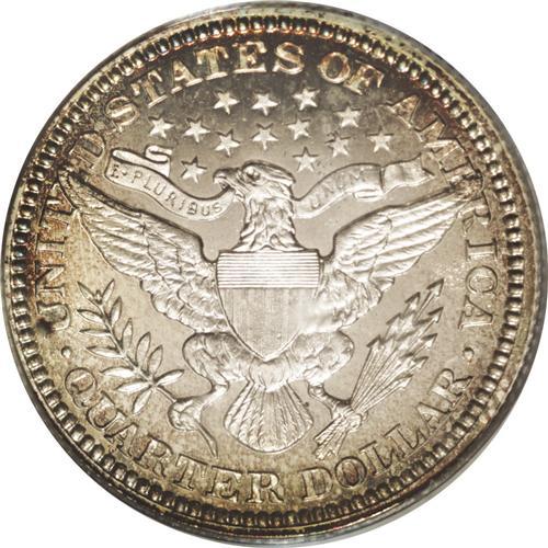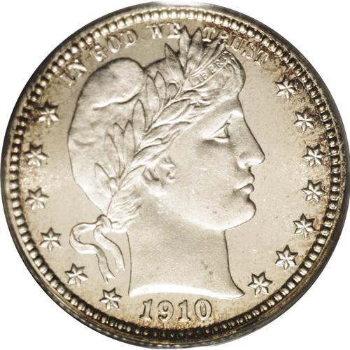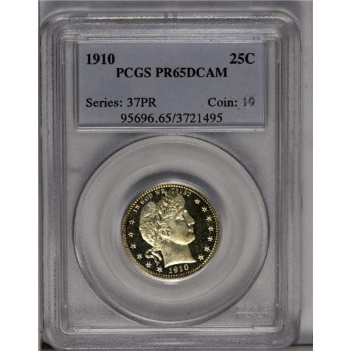 <B>1910<25C> PR65 Deep Cameo PCGS.</B></I> A mere 551 proofs were struck during 1910, few of them able to claim a Deep Cameo designation. The devices are well frosted on this nice example, and are handsomely contrasted by the deeply mirrored fields. The strike is excellent, hints of golden-russet color borders the obverse and reverse. Population: 2 in 65 Deep Cameo, none are finer (6/06).