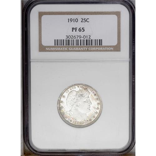<B>1910<25C> PR65 NGC.</B></I> This razor-sharp Gem exhibits obvious cameo contrast between the frosty portrait and the multicolor obverse field, but perhaps has been denied a Cameo designation because of apple-green, peach, and powder-blue reverse toning. The mintage of 551 pieces is among the lowest of the Barber type.