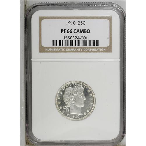 <B>1910 25C PR66 Cameo NGC.</B></I> An even finer proof representative from this comparatively low mintage issue of just 551 pieces. The noteworthy contrast between fields and devices on this snowy-white Premium Gem is especially profound on the obverse. Census: 10 in 66, 20 finer (12/06).<BR><BR><b>Shipping:</b> Coin/Currency (<a target="_blank" href="http://www.heritageauctions.com/common/shipping.php">view shipping information</a>)