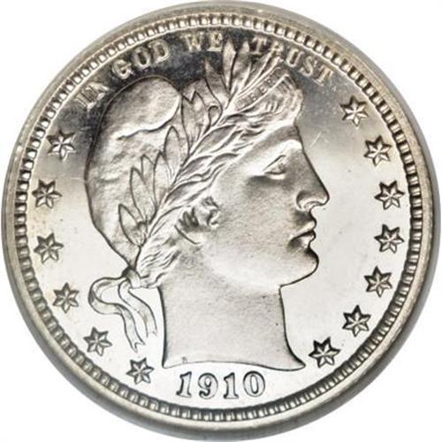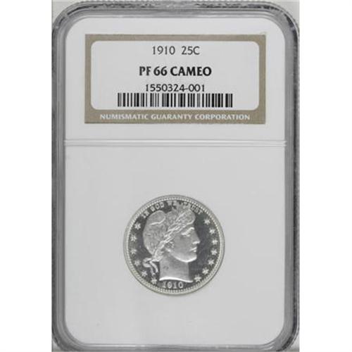 <B>1910 25C PR66 Cameo NGC.</B></I> An extraordinary proof representative from this comparatively low mintage issue of just 551 pieces. The noteworthy contrast between fields and devices on this snowy-white Premium Gem is especially profound on the obverse. Census: 12 in 66 Cameo, 22 finer (1/08).<BR><BR><b>Shipping:</b> Coins & Currency (<a target="_blank" href="http://www.heritageauctions.com/common/shipping.php">view shipping information</a>)