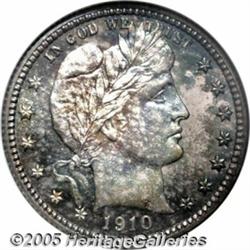 <B>1910 25C PR67 NGC.</B></I> It appears that beneath the toning there is a significant amount of mint frost on the devices, enough perhaps to warrant a cameo designation. But what a shame it would be to dip this coin. The surfaces are covered with a fantastic array of golden, blue, and rose toning, much of which is speckled, deeper around the margins, and deeper in hue overall on the reverse. Just a beautiful proof and lacking any evidence of technical demerits, thus the Superb grade. Population: 31 in 67, 9 finer (2/05).