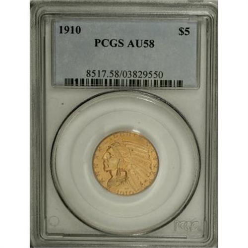 <B>1910 $5 AU58 PCGS.</B></I> PCGS Population (468/1816). NGC Census: (678/2605). Mintage: 604,250. Numismedia Wsl. Price for NGC/PCGS coin in AU58: $323. (#8517)<BR><BR><B>Coin Engraver:</B> Bela Lyon Pratt<BR><BR><b>Shipping:</b> Coins & Currency (<a target="_blank" href="http://www.heritageauctions.com/common/shipping.php">view shipping information</a>)