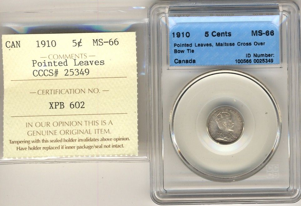 1910 5 Cents, CCCS MS-66; Pointed Leaves, crossed ICCS.