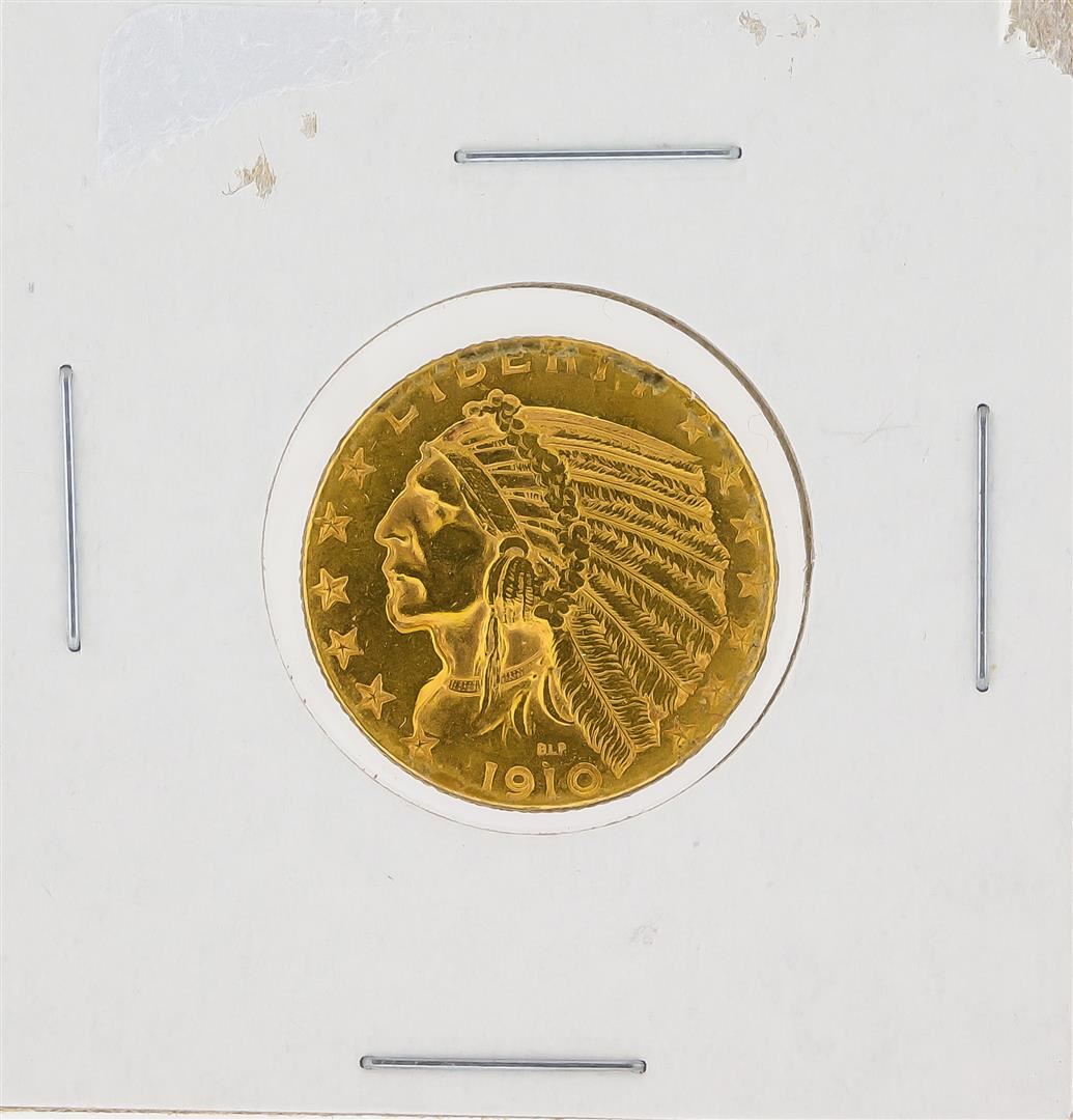 One 1910 $5 Indian Head Half Eagle Gold Coin.